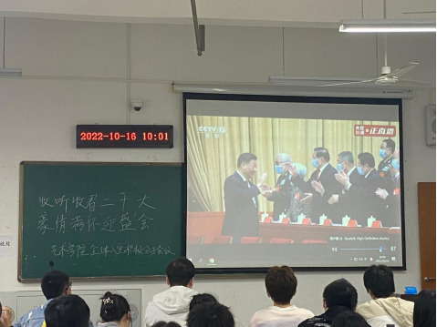 10月16日,周日,上午10:00,中国共产党第二十次全国代表大会在北京隆重开幕。williamhill威廉希尔全体入党积极分子和全体2022级新生及广大同学怀着激动与崇敬之情在williamhill威廉希尔党总支的组织下在尚艺楼A401、A402、A404、A405、A501等教室集中观看党的二十大开幕会直播,其他年级的学生在宿舍或其他教室观看,学院全体党员在A306观看。