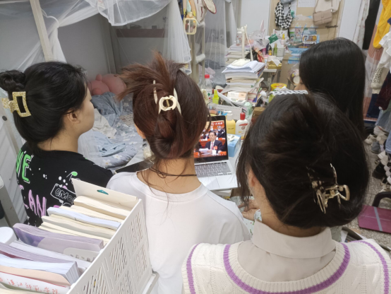 教室里,同学们正聚精会神看直播,认真聆听习近平同志代表第十九届中央委员会向大会作题为《高举中国特色社会主义伟大旗帜 为全面建设社会主义现代化国家而团结奋斗》的报告。